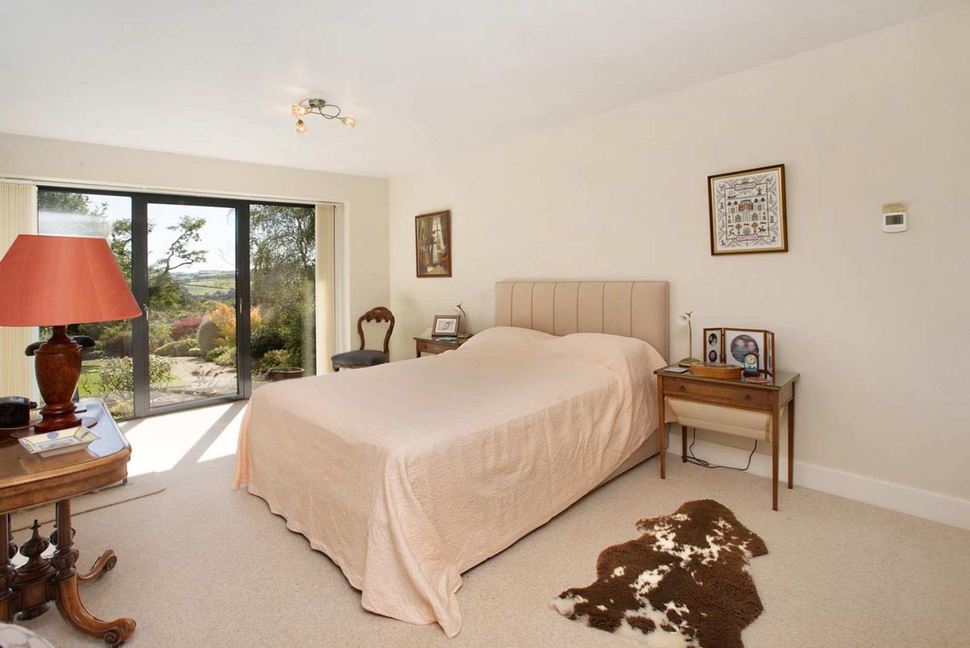 A beautiful principal bedroom suite with a large full height window taking in breathtaking views across Huntley’s grounds and also taking views towards a sweep of the Teign Estuary and rolling countryside beyond. There is a comprehensive range of luxury built-in bedroom furniture comprising two wardrobes and a chest of drawer/dressing table with built-in cupboards above. There is a wall mounted air-conditioning unit, feature light fitments and a timber door opens to the…..