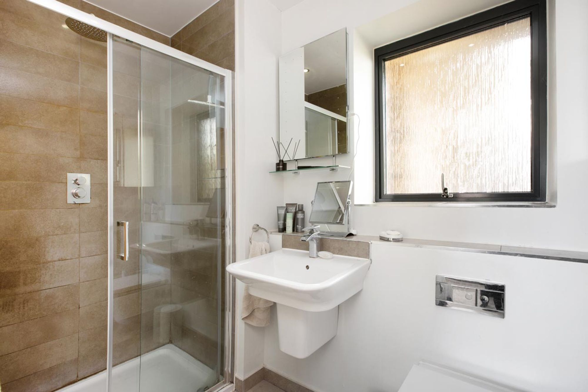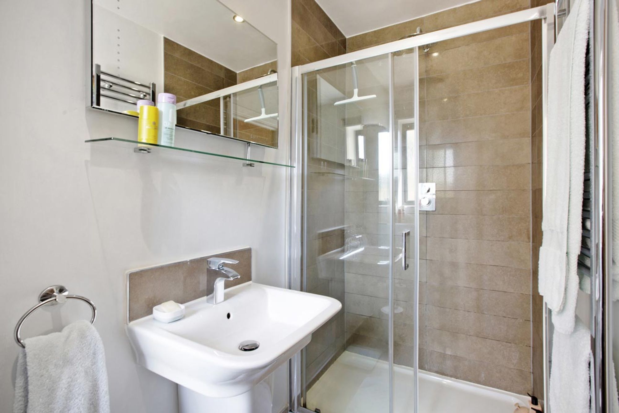 Having a luxury three-piece suite comprising a large, tiled shower cubicle with large showerhead and dual controls, a wall mounted wash hand basin and a WC. Demist mirror, full height medicine cabinet, opaque glazed window, spotlights and extractor fan.