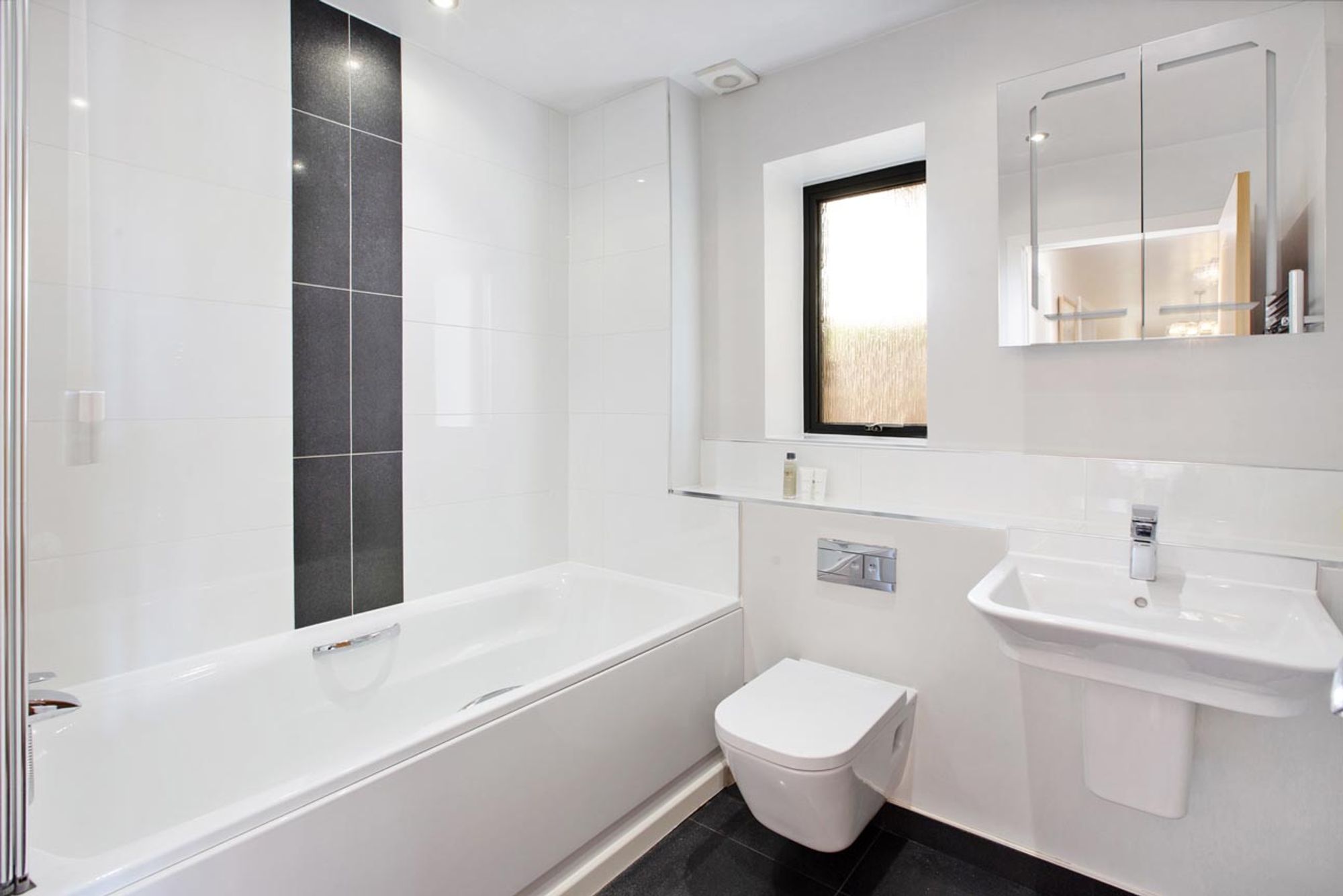Having a luxury three-piece suite comprising a large panel bath with full height tiled surround, attached folding shower screen and shower attachment on the mixer set, a wall mounted Roca wash hand basin and a WC. Large ceramic floor tiles, medicine cabinet with de-mist mirror and LED lighting, opaque glazed window, extractor fan, spotlights and ladder style radiator/towel rail.