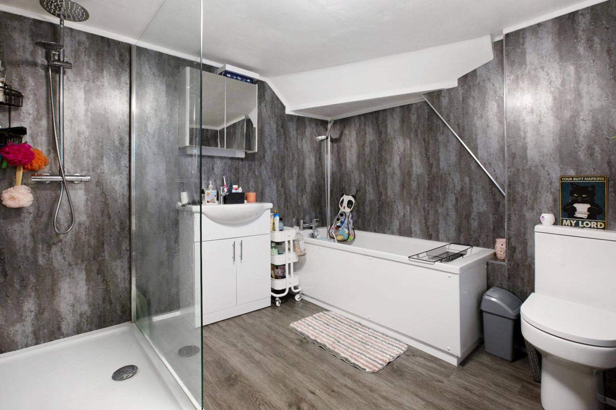 Low level WC, bath with mixer tap and shower attachment over, wash hand basin set into vanity unit, shower enclosure with glazed shower screen, dual function shower, fitted extractor, ladder style towel rail/radiator, uPVC obscure double glazed window, fitted extractor.