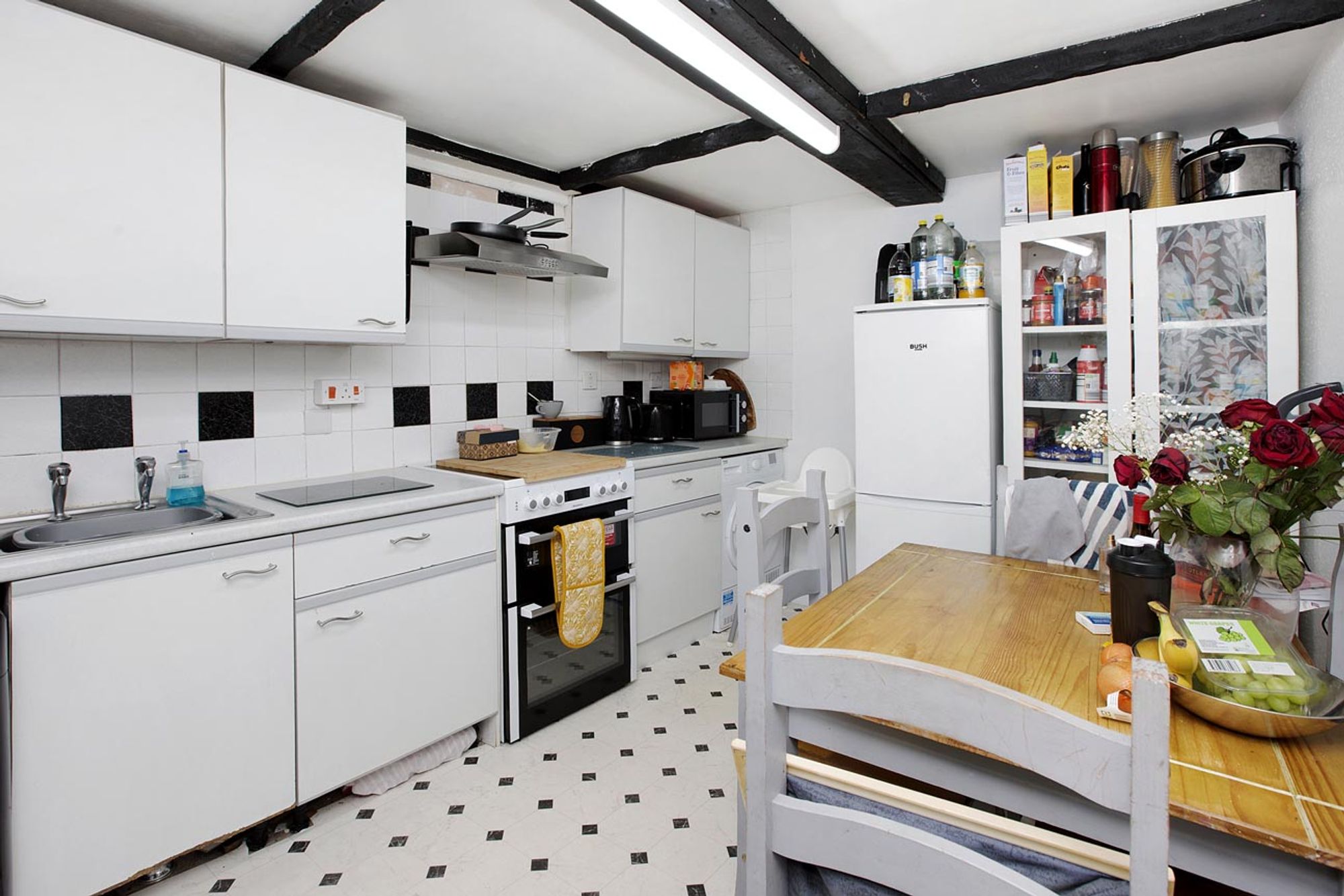 Cupboard and drawer base units under laminate rolled edge work surfaces with tiled splash backs, space and plumbing for washing machine, space for cooker with fitted extractor hood over, further appliance space, single drainer stainless steel sink unit, corresponding eye level units, space for upright fridge freezer, space for table and chairs, exposed beams, uPVC double glazed window overlooking the approach. Radiator.